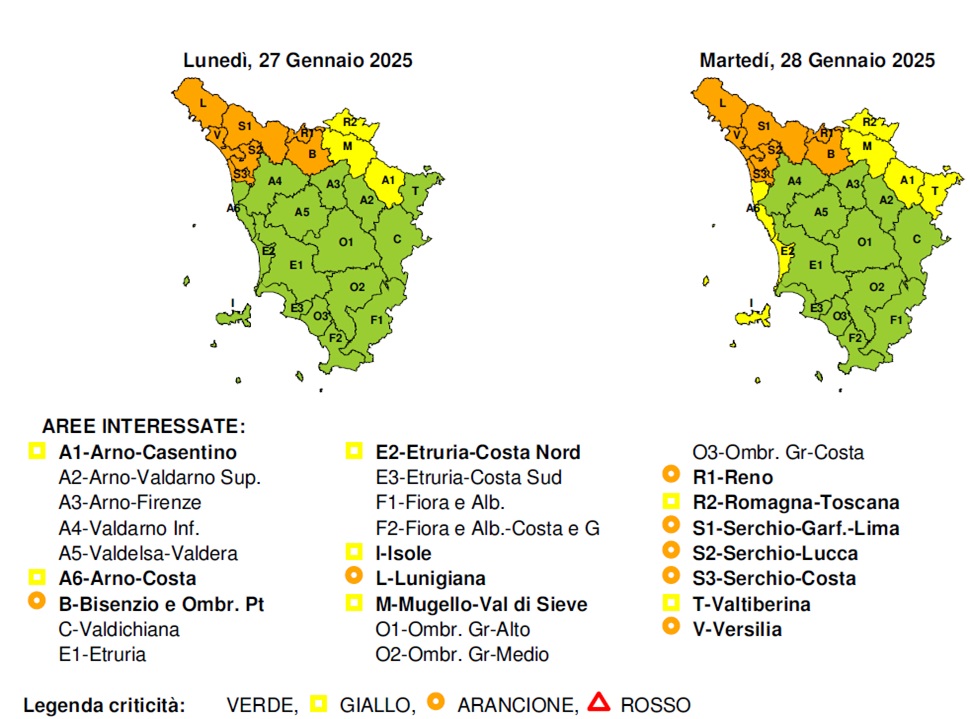Il codice giallo per rischio vento sarà in vigore dalla mezzanotte (ore 23.59) di oggi, lunedì 27 gennaio, fino alla mezzanotte (ore 23.59) di domani, martedì 28 gennaio, mentre il codice giallo per rischio mareggiate sarà in vigore domani, martedì 28 gennaio, dalle ore 11 fino a mezzanotte.