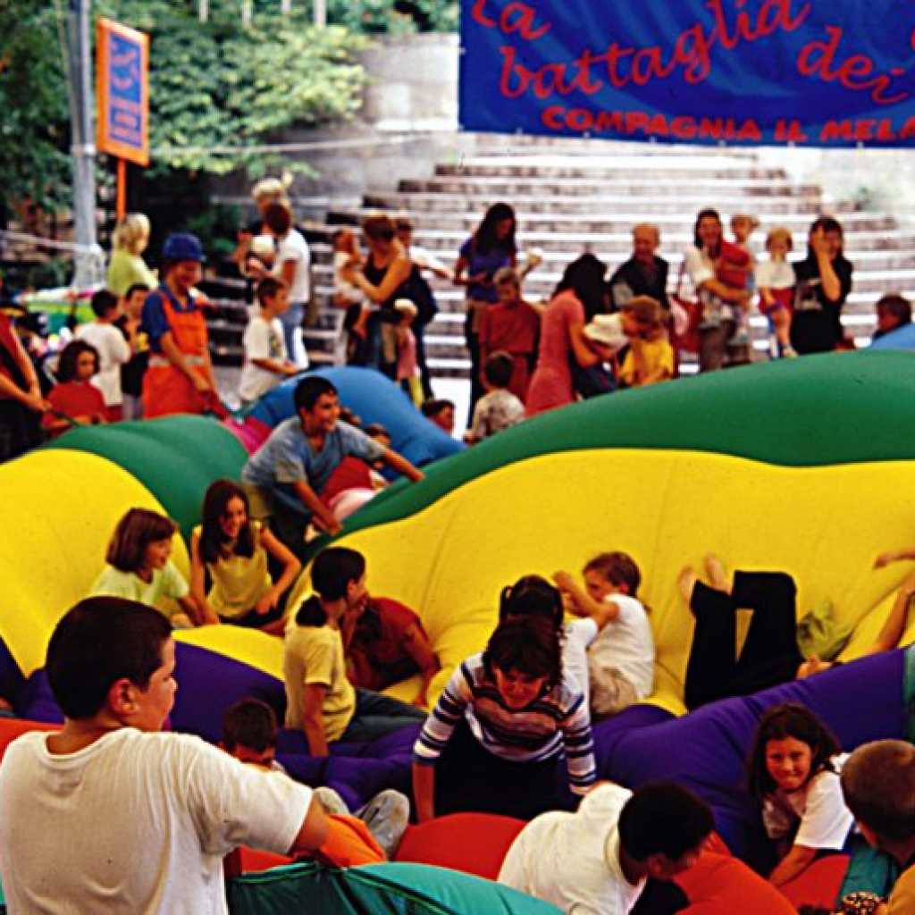 Il ricordo degli scontri all’ultima piuma che da bambini, tra fratelli, si facevano sul letto prima di andare a dormire: qui il gioco viene centuplicato più e più volte, diventando uno spettacolo di piazza esplosivo, divertente e di grande coinvolgimento. Centinaia di leggerissimi cuscini multicolori compaiono in scena e in una reazione a catena esplode la battaglia: accompagnati dalle scatenatissime musiche ska, gli spettatori si trovano coinvolti in una piccola follia collettiva, dove tutti combattono contro tutti, che coinvolge giovani, bambini, genitori e nonni. Questa pazza ed inoffensiva lotta a colpi di cuscino, prosegue fino allo sfinimento dei partecipanti. Ad un preciso segnale tutto si ferma e la battaglia si conclude in un soffio di piume.