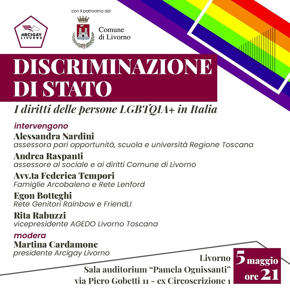 Venerdì 5 maggio alle ore 21 la sala auditorium "Pamela Ognissanti" (via Piero Gobetti, 11) ospiterà una iniziativa pubblica organizzata da Arcigay Livorno intitolata "Discriminazione di Stato. I diritti delle persone LGBTQIA+ in Italia".