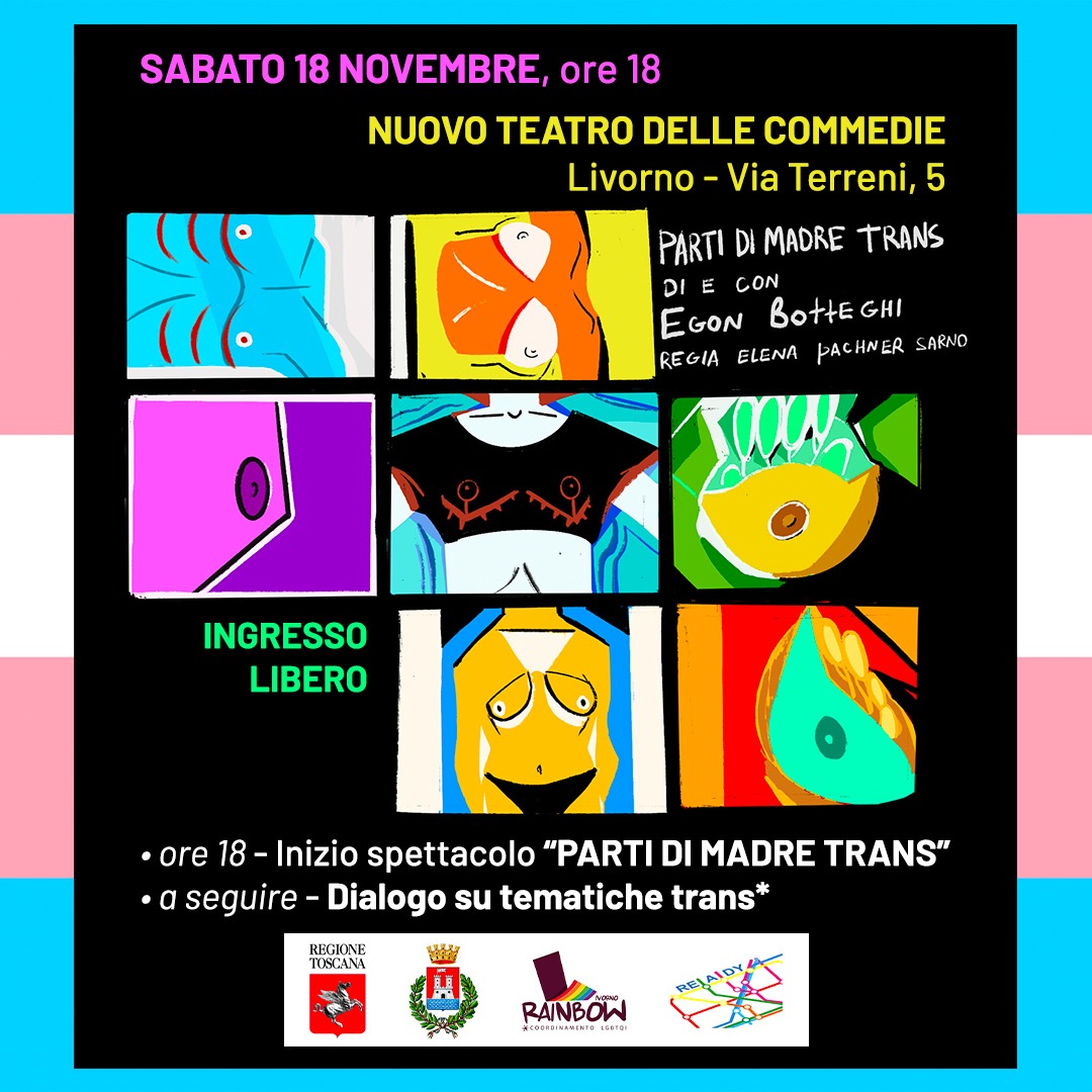 Sabato 18 novembre, alle ore 18, presso il Nuovo Teatro delle Commedie, in via Terreni 3 a Livorno, andrà in scena la performance "Parti di Madre Trans*", di Egon Botteghi per la regia di Elena Pachner Sarno, una performance che è insieme un seminario, una testimonianza e un gioco a premi, in cui si affronta il tema della genitorialità delle persone trans*.