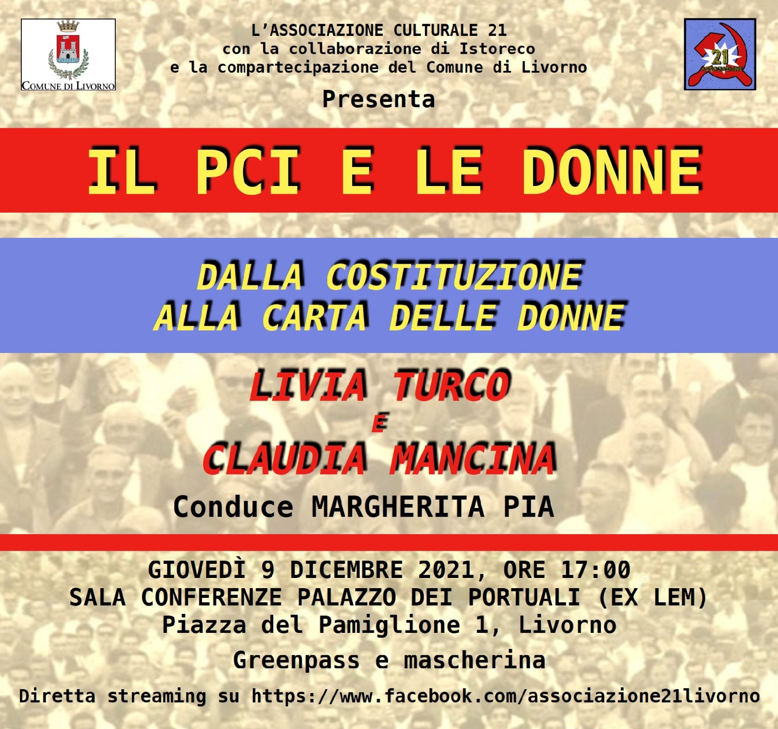 Organizzato da dall’Associazione Culturale “21” nell’ambito delle iniziative dedicate al centenario della nascita del PCI con la collaborazione di Istoreco e la compartecipazione del Comune di Livorno, l'evento registrerà l'intervento di Livia Turco e Claudia Mancina. Condurrà i lavori Margherita Pia.