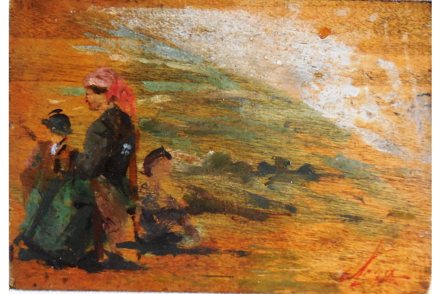 Bella e curiosa dal punto di vista storico è questa minuscola tavoletta di Giovanni Lessi (Firenze 1852-1922) che rappresenta “Lo studio del maestro Vito D’Ancona” dipinto nel 1876. Già proprietà di Mario Galli, mecenate e collezionista dei Macchiaioli, il piccolo dipinto rappresenta D’Ancona nel suo studio mentre dipinge uno dei suoi nudi più belli. Tale nudo andò a far parte della prestigiosa collezione Rosselli.