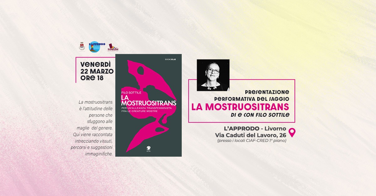 Nella settimana del TDOV, la Giornata Internazionale della Visibilità Transgender che si celebra il 31 marzo, il Centro Ascolto LGBTQ+ L’Approdo organizza una presentazione performativa del libro “La Mostruositrans” (Eris Edizioni) di e con Filo Sottile nella giornata di venerdì 22 marzo alle ore 18 in Via Caduti del Lavoro 26.
