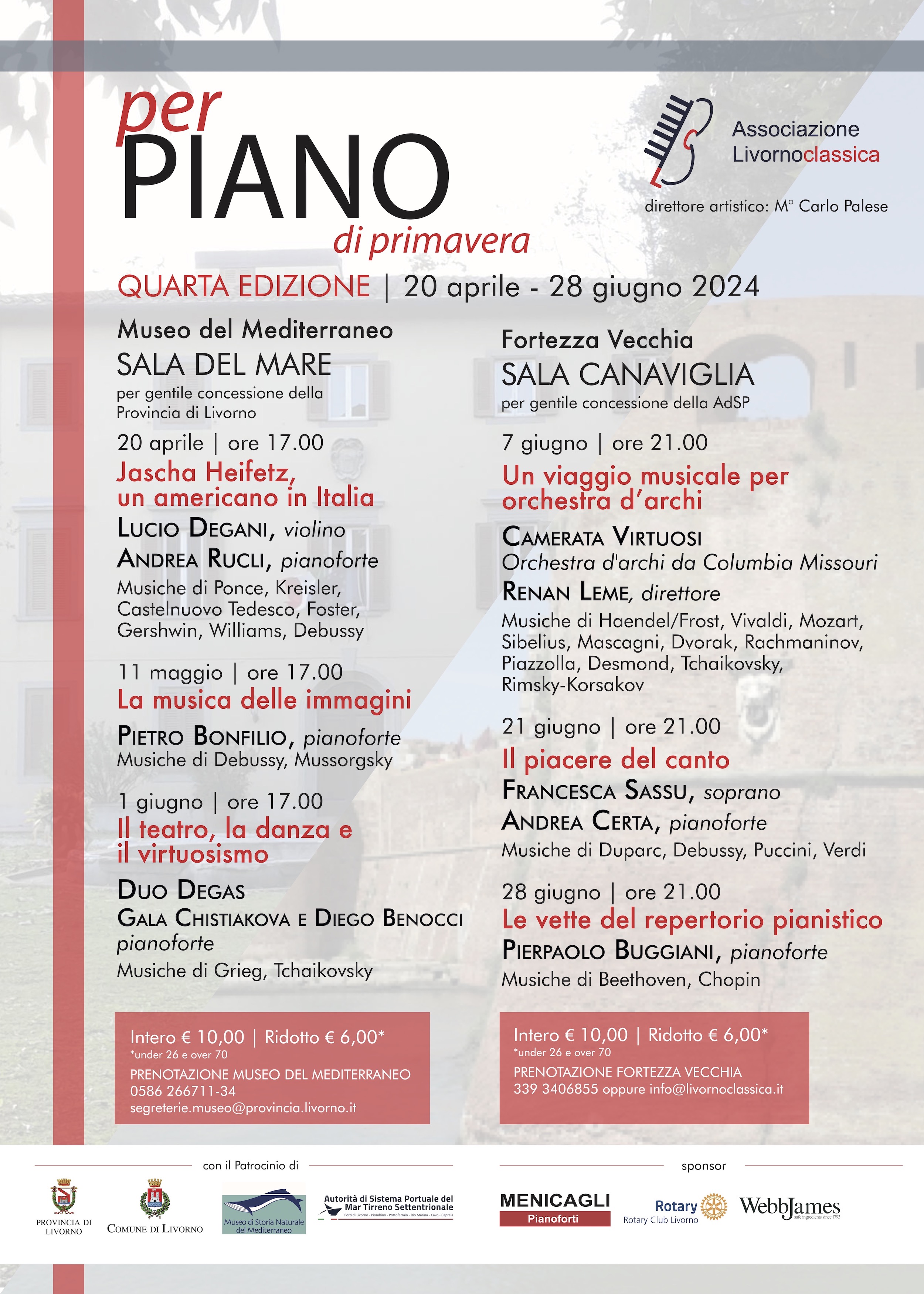 Ad aprire la rassegna, sabato 20 aprile , saranno il violinista Lucio Degani e il pianista Andrea Rucli, due artisti che vantano una più che trentennale carriera internazionale: “Un Americano in Italia ” si ispira musicalmente alle “gesta” di Jasha Heifetz, grande violinista russo naturalizzato statunitense il quale, al seguito delle truppe alleate durante la seconda guerra mondiale, donava al pubblico un momento di grazia e serenità eseguendo un repertorio di grande appeal. Il programma spazia dalla Vienna di Kreisler, a musiche tradizionali, fino a George Gershwin e John Williams con lo struggente “Schindler’s list”.
