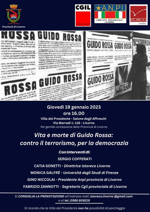 Ci aiutano in questa riflessione il libro di Luzzatto su Guido Rossa (Giù in mezzo agli uomini: vita e morte di Guido Rossa, Ed. Einaudi, 2021) e la storica Monica Galfré, che saranno affiancati dalle riflessioni di un grande dirigente della Cgil, Sergio Cofferati e quelle di un giovane segretario di Camera del Lavoro di Livorno, Fabrizio Zannotti. Accanto a loro saranno presenti Gino Niccolai, presidente dell'Anpi provinciale e Catia Sonetti, direttrice dell'Istoreco di Livorno.
